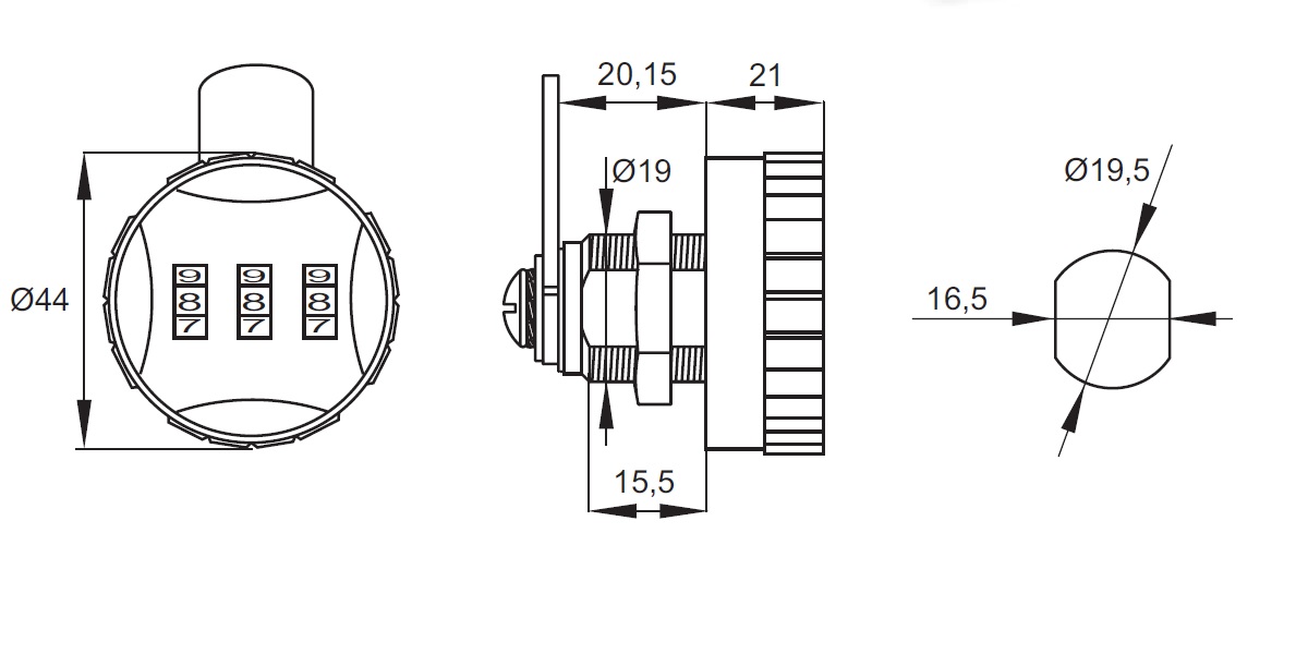Combi. Cam Lock #213,3-Digit,RH,ø44mm House,Black/Grey,90DG ø19X20mm Cylinder, Straight Cam,C/E:40mm, W/Hex Nut, Pre-Coded 000, Changing Code By Pressing Metal Pin On Side Of Housing into the Housing in Open Position