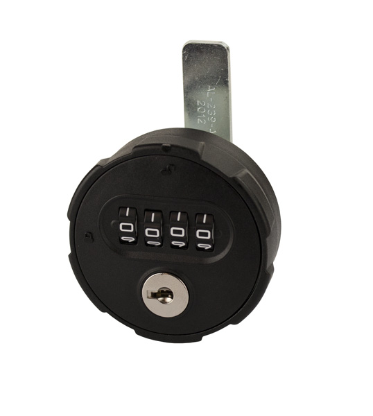 Combi. Cam Lock M300,4-Digit,RH,ø60x25mm,Black,90DG,"Public" , Straight Cam,C/E:45mm,W/Hex Nut, Precoded 0000, Master Code A201. F/Panel Thickness <19mm, Plastic Housing