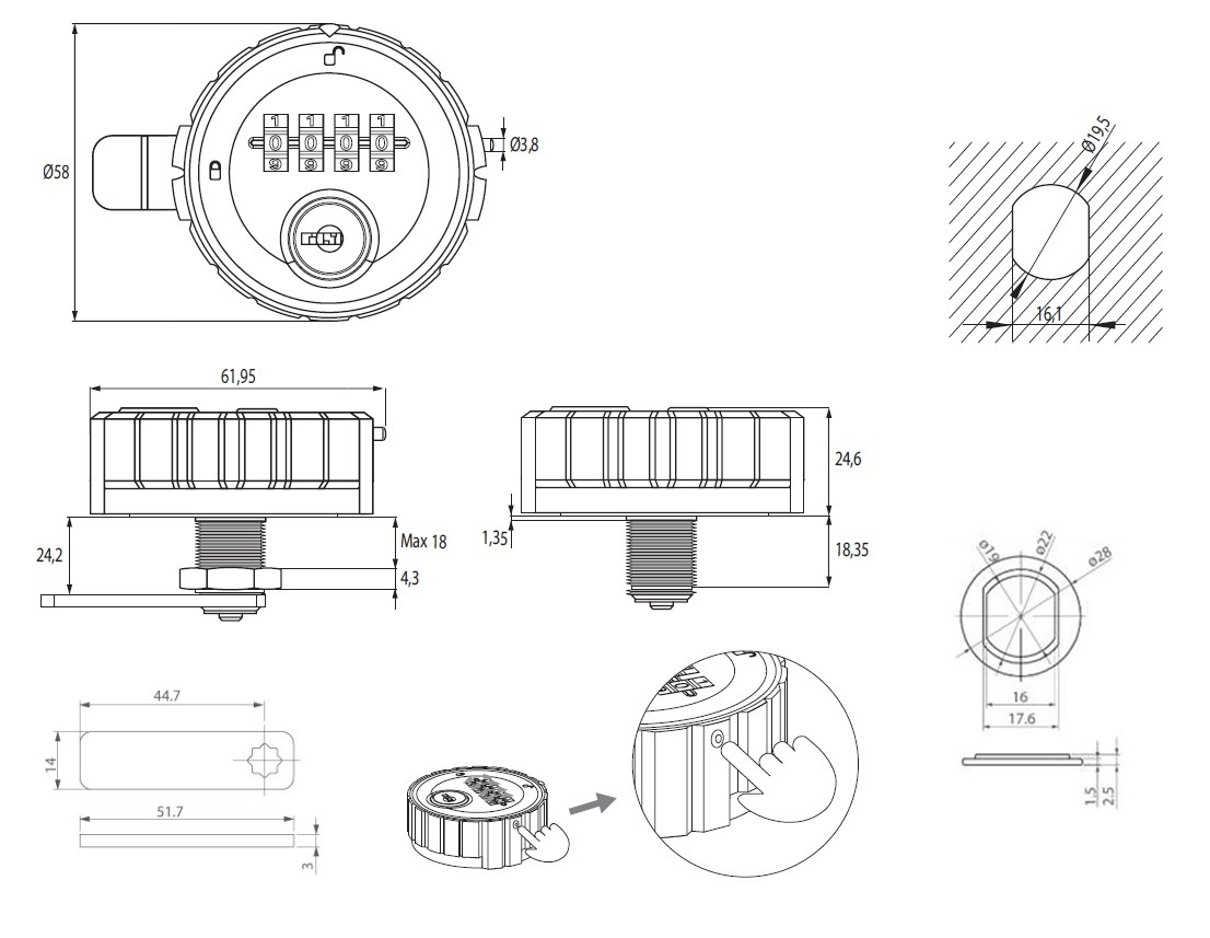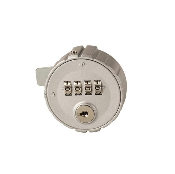 Combi. Cam Lock M316,4-Digit, ø60x24mm, RH, Zamak, Silver, Ø19X24mm Cylinder,90DG,Straight Cam,C/E:45mm,W/Hex Nut,Pre- Coded 0000, Changing Code By Pressing Metal Pin On Side of Housing into the Housing in Open Position, Master Code A201 Incl. Hole Size Reduction Washers from ø22 to ø19mm