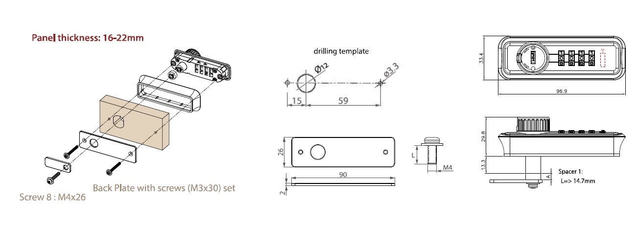 Surface Mount Handle/Housing, F/Lock M3001/M3002, Incl.: Cylinder Extension 14,7mm Length with 8x8mm Cam Hole Size, & Black Plate 14.08.237-0, F/16-22mm Panel Thickness, Attention: Remember to buy Extra Cam Plate with 8 x 8 mm Hole Size