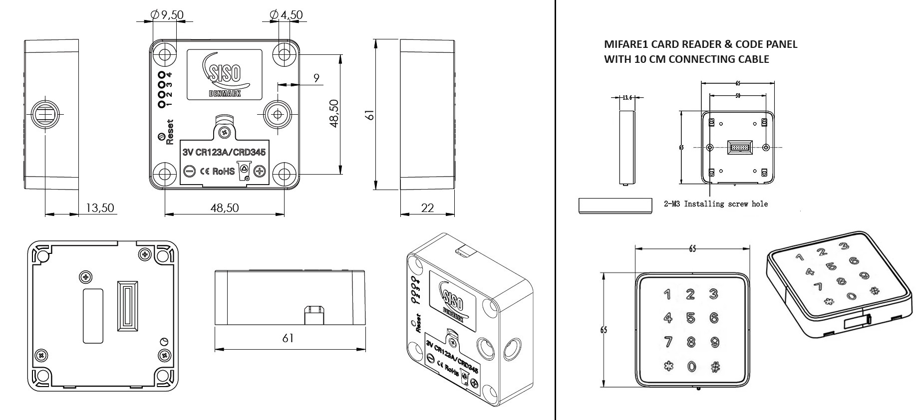 Invis. Mifare1 Lock "Mini" W/Card Reader & Code Panel, ABS, Black, 61x61x22mm SISO DK logo No Accessories, No Striker or Batteries Can be Programed to Public, Private or Office Mode W/Non Locking & Low Battery Alarm