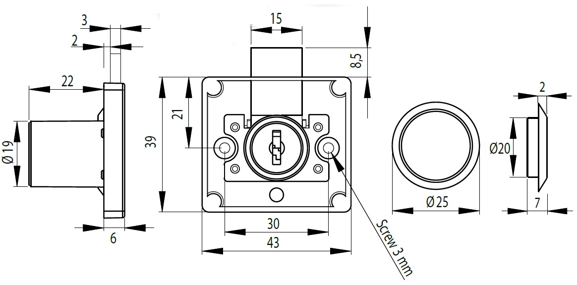 Rim Lock 852, ø19x22mm (Slim Case), Nickel Plated, HCK SISO