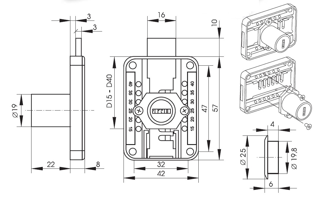 Rim Lock MIC965, ø19x22mm, Right, NPL, HCK SISO,#J11,Adjust able Cylinder, Backset 15,20,25,30,35 or 40mm, Pre-installed Pre-installed to 25mm