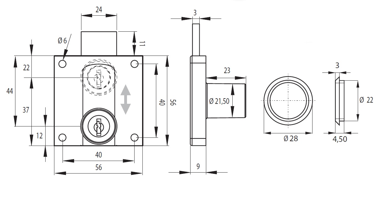 Rim Lock Serbia W/Adjustable Cylinder, ø21,5x23mm, MK SISO, Nickel Pl., Backset From 22 to 44mm