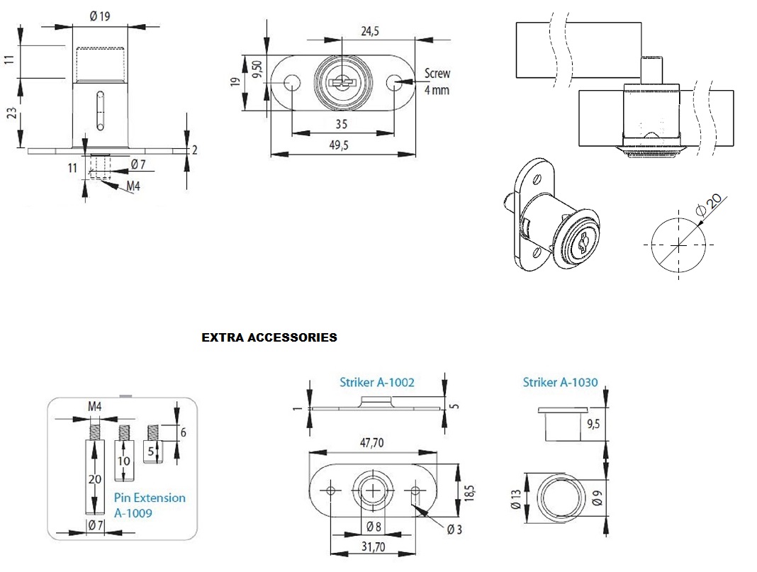 Push Button Lock T-1003, ø22x23mm, NPL, TCK SISO, 2000 KD, Tubular Keys