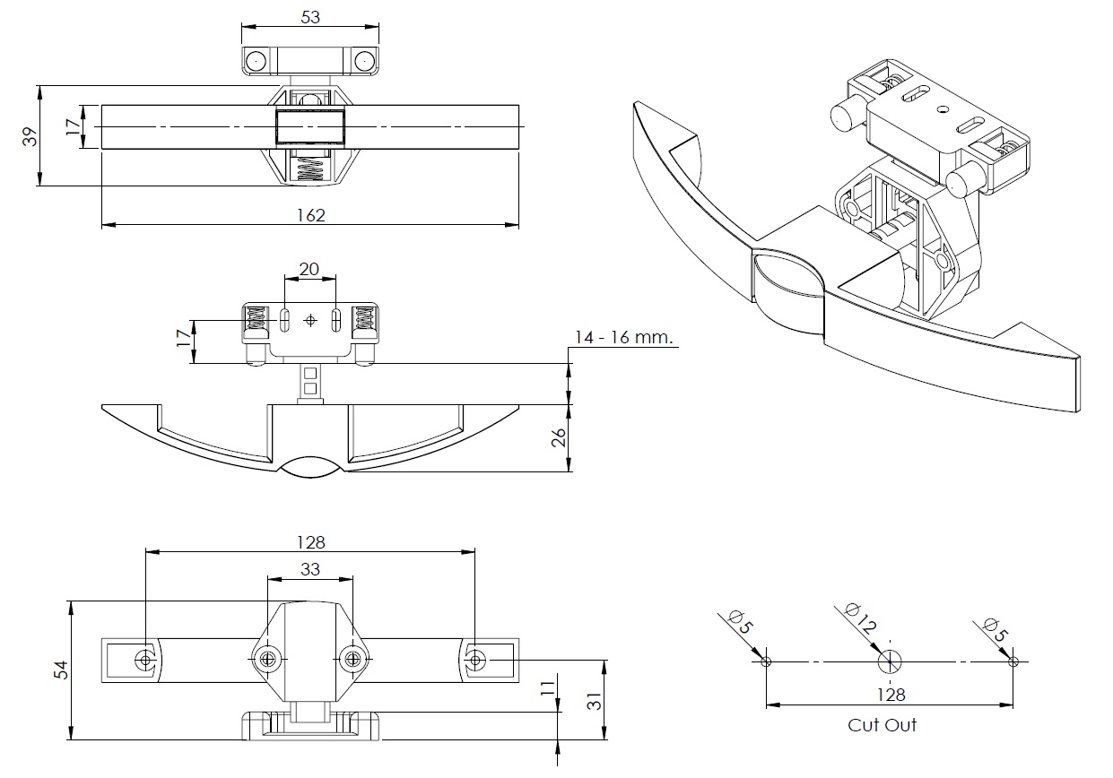 Slam Lock Handle "RV", 14-16mm, cc128mm, CPL, Zamak Handle & Grey ABS Housing, Incl. Grey ABS Striker W/Spring Tension
