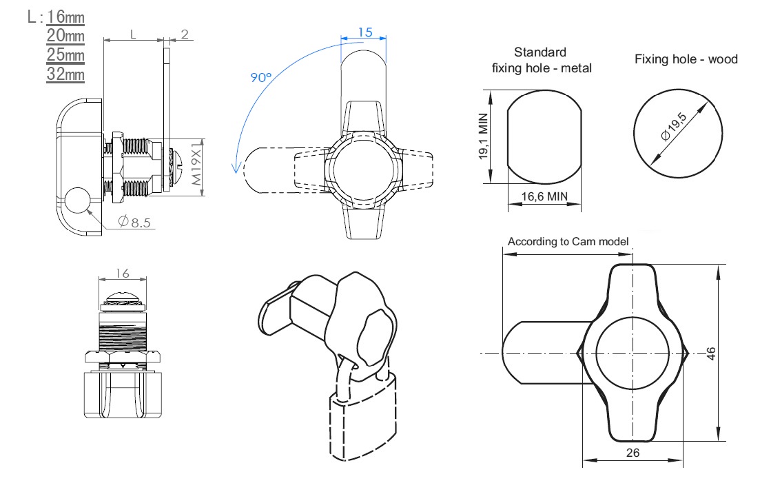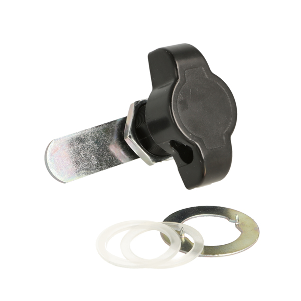 Padlockable Cam Lock #300R, 90DG, ø19x20mm, Black, Cam A04, Straight C/E: 40 mm, NO Anti Rotating Plate, F/Shackle Size Ø5 - to 7 mm - min.16mm Width