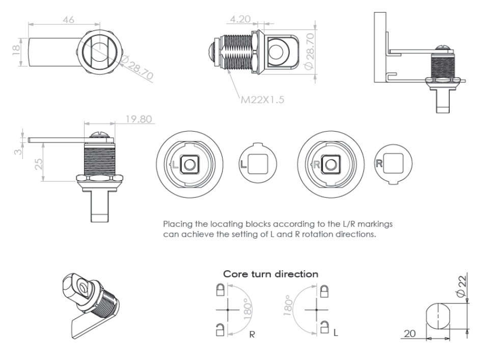 Padlockable Cam Lock "Roto", 180DG, L/R, ø22x25mm, Chrome Plated, Straight Cam Plate C/E: 45mm, Pre-installed as Right Hand, Can be Changed to Left Hand, Hex Nut Fixing, 8mm Shackle Hole