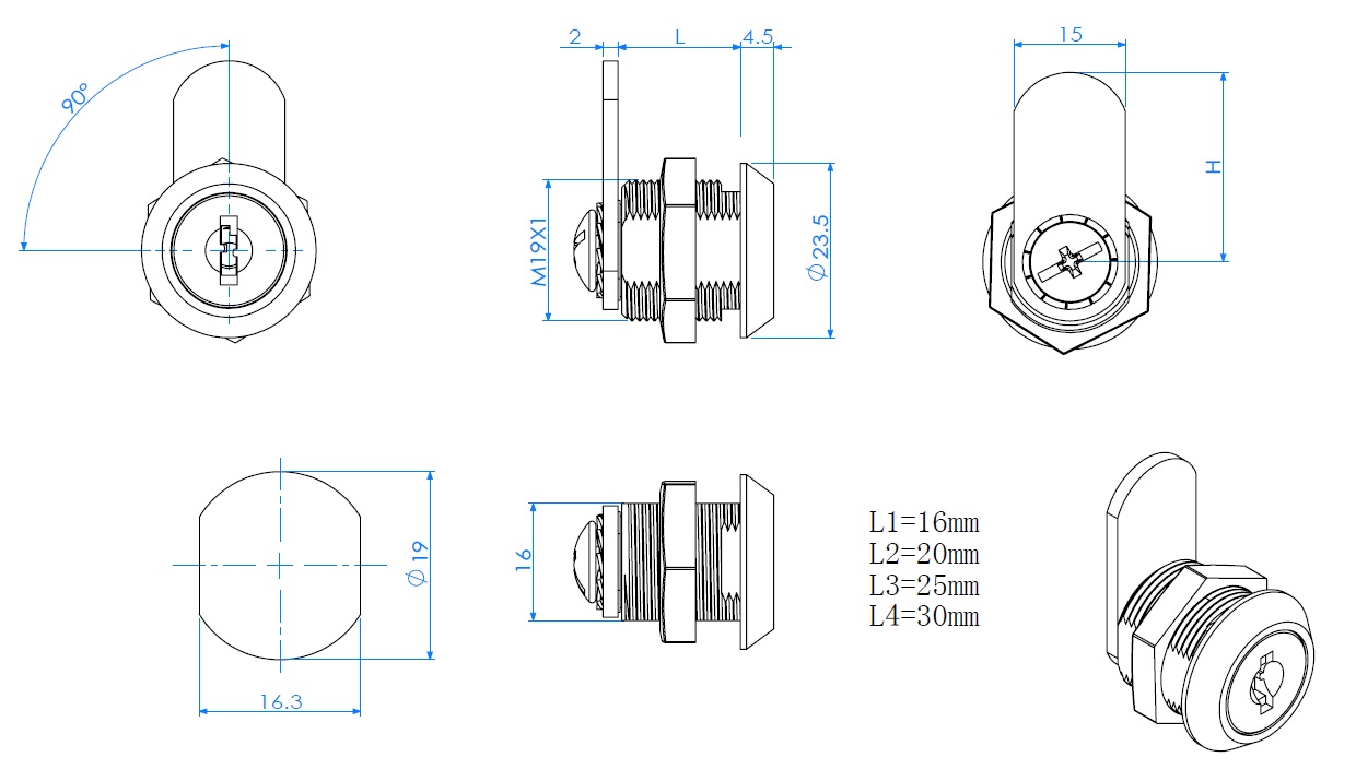Cam Lock 1916, 90DG, Black Anod, Cam No. A01, KA D20,CK SISO