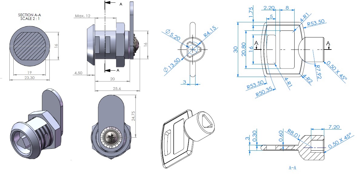 Cam Lock 1920, 90DG, W/Triangular Zamak Bit Key, Cam A01,CPL Max. 12mm Panel Thickness