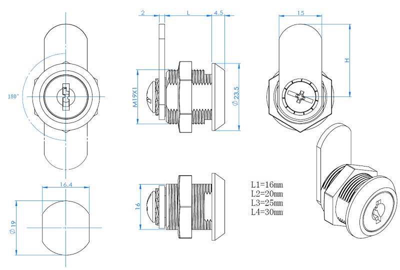 Cam Lock 1925, 180DG, CPL, Cam A06, W/3 CK SISO,W/1 L-Shaped Striking Plate