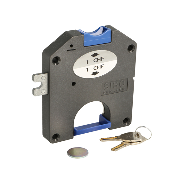 Coin Lock F/1 CHF,W/MIC System #01,CPL,LH, Snake SISO Metal Keys, Black Plastic Body, Coin Entrance & Exit All Blue Plastic, W/SISO Logo on Lock Body, w/Chrome Plated Rosette, Included 1 Master Key + MIC Key Pr. Inner Box