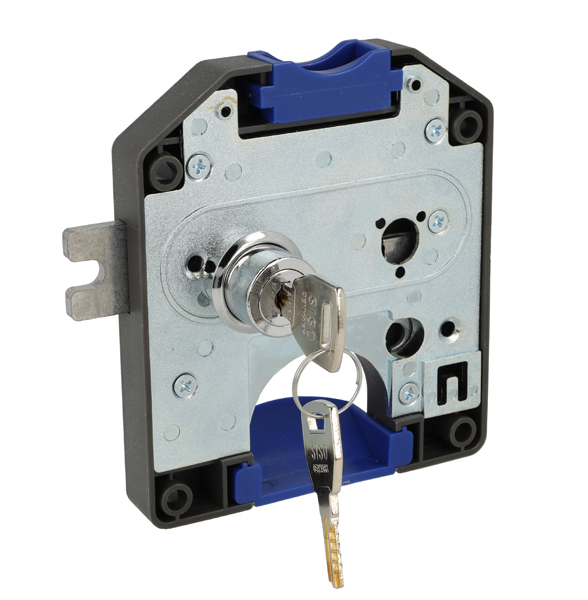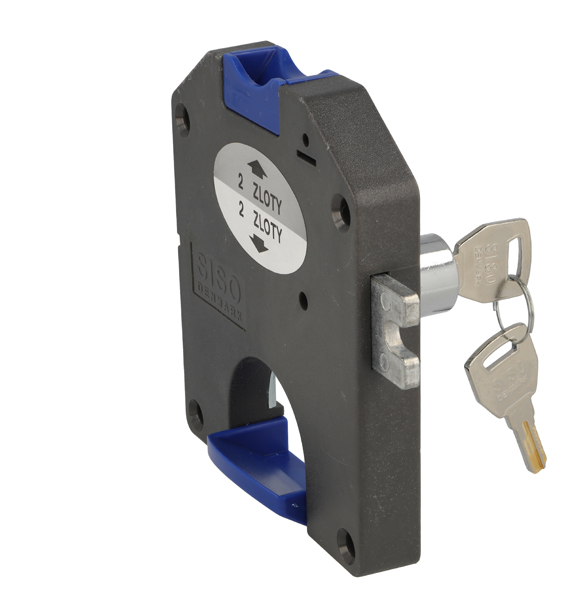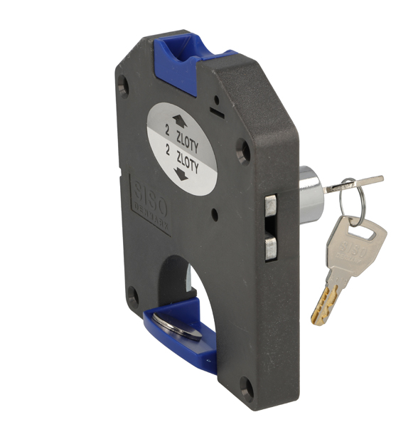 Coin Lock F/2 Zloty,W/MIC System #01,CPL,RH,Snake SISO Metal Keys, Black Plastic Body, Coin Entrance & Exit All Blue Plastic, W/SISO Logo on Lock Body, w/Chrome Plated Rosette