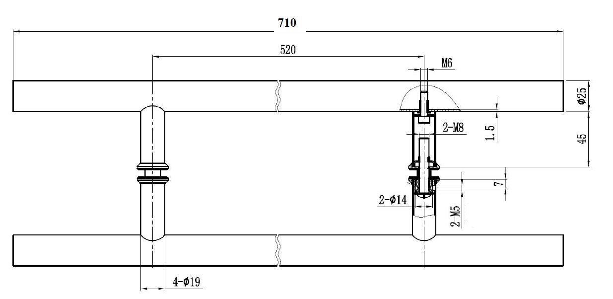 Door Handle "Oder" SS304 Polished Brass, ø25x710mm, cc 520mm 8-12mm Glass Thickness, Bore: ø12mm