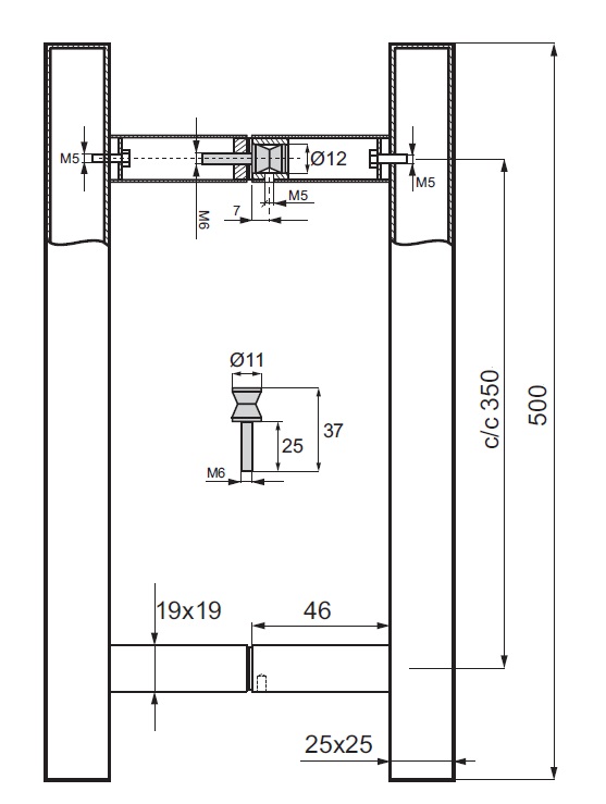 Door Handle "Sava" SS304 Brushed, 25x25x500mm, cc 350mm, 8-12mm Glass Thickness, Bore: ø12mm