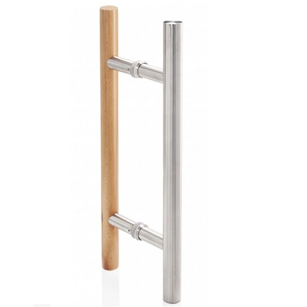 Sauna Door Handle "Drava" SS304 Brushed, ø32x500mm, cc 300mm 8-12mm Glass Thickness, Bore: ø12mm; Beech Wood - lacquered + Brushed SS304
