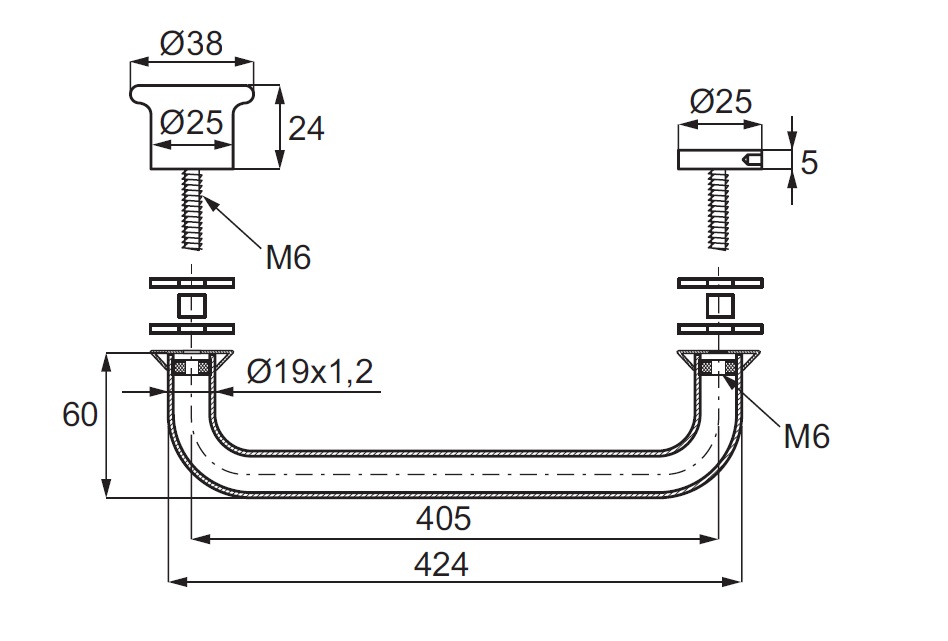 Towel Bar "Loire" W/Pull Knob, SS304 Polished, ø19x424mm, cc 405, 8-12mm Glass Thickness