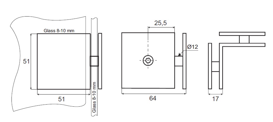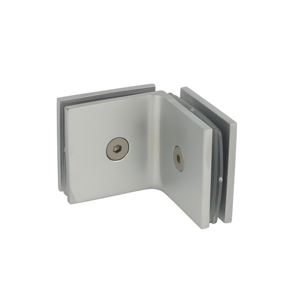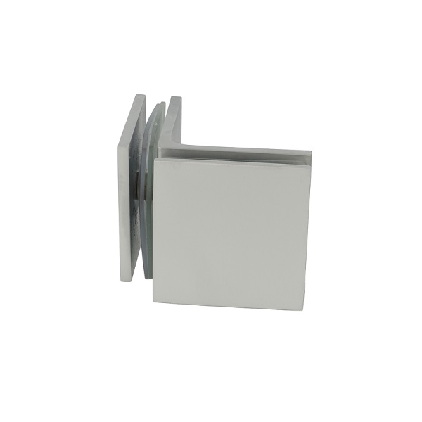 Glass Clamp "Bern", 90DG, Alu-Look, Glass/Glass, 51x51x17mm, Square Corners, 8-10mm Glass, Glass Mounted By ø12mm Drilling, Brass Material