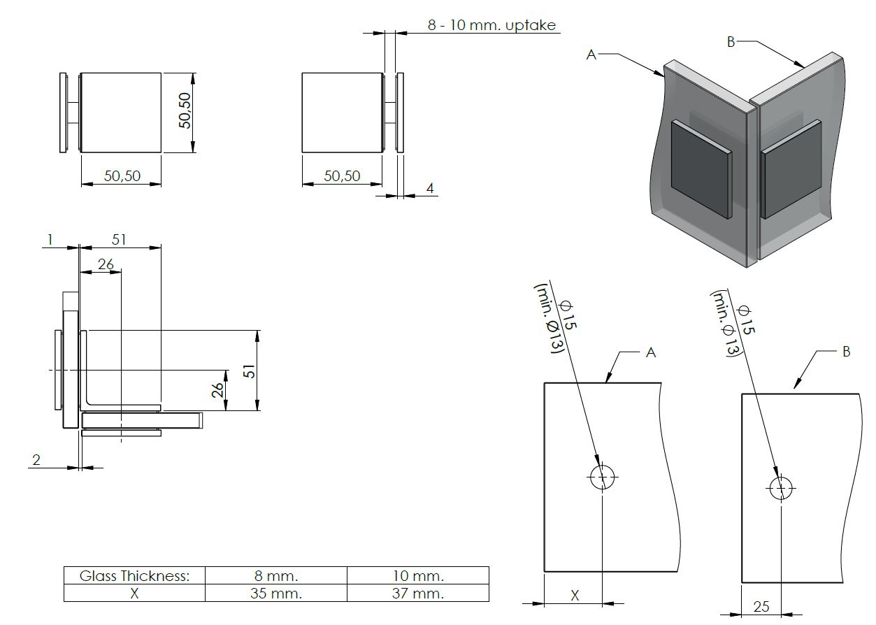 Glass Clamp "Bern", 90DG, CPL, Glass/Glass, 51x51x17mm, Square Corners, 8-10mm Glass, Glass Mounted By ø12mm Drilling, Brass Material