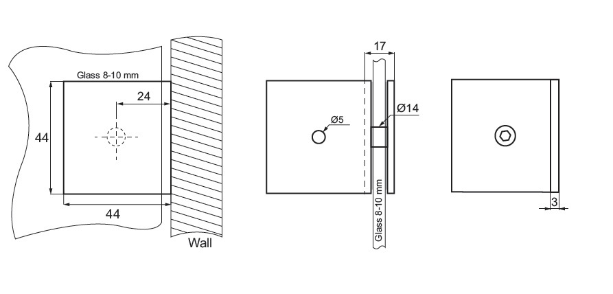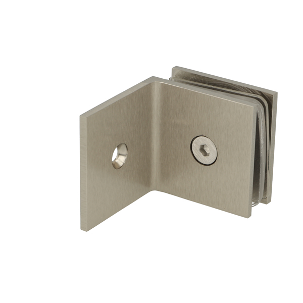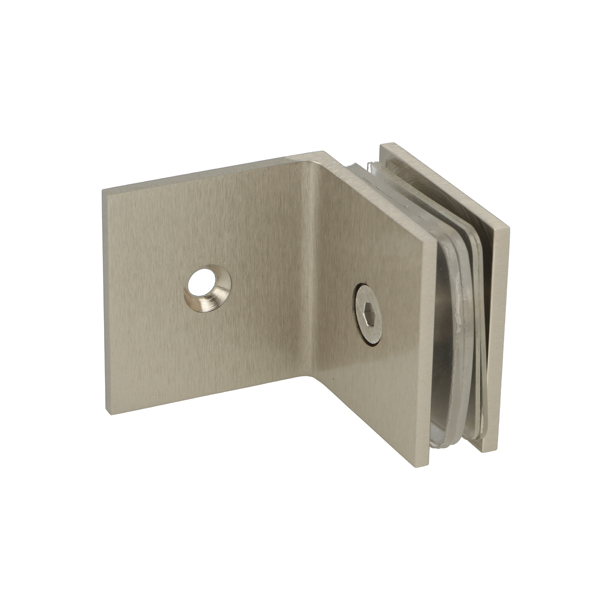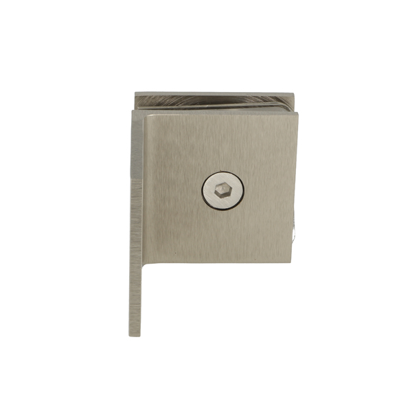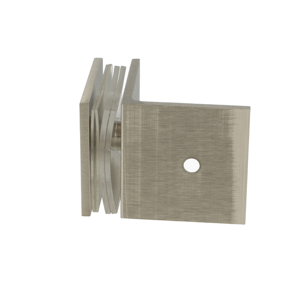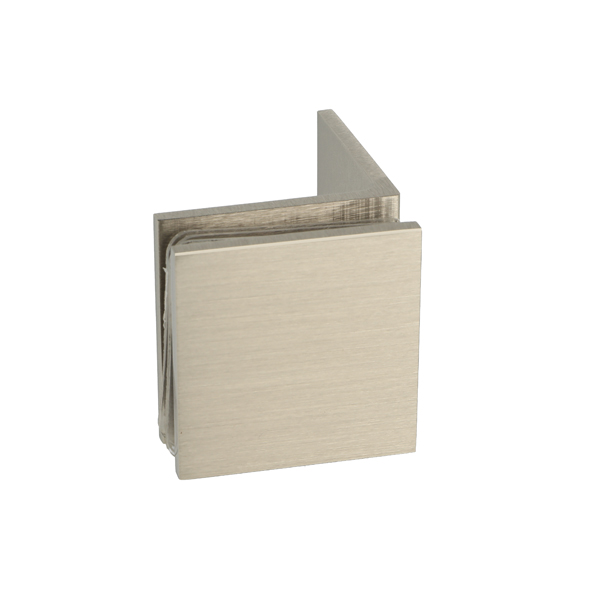 Glass Clamp "Berni", 90DG, SS-Look, Glass/Wall, 44x44x17mm, Square Corners, 8-10mm Glass, Wall Mounted By ø5mm Screw Hole, GLass Mounted By ø12mm Drilling, Brass Material