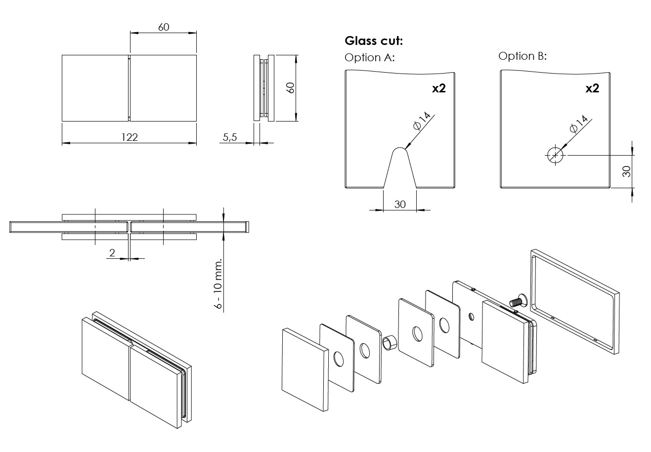 Glass Clamp "Lima", 180DG, Brushed Copper, Glass/Glass, 122,4x60x20,5mm, 6-10mm Glass, Glass Mounted By ø14mm Drilling, Hidden Screws, Brass, Alu & SS-304 Material