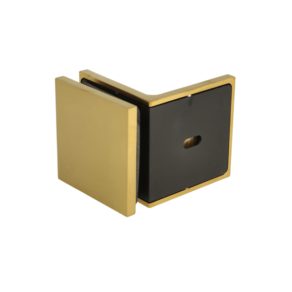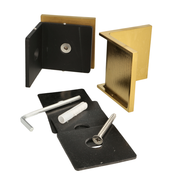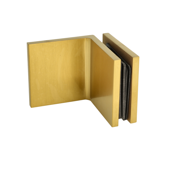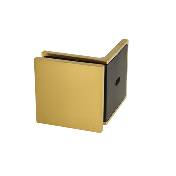 Glass Clamp "Lima", 90DG, Brushed Brass, Glass/Wall, 60x60x 20,5mm, 6-10mm Glass, Wall Mounted By ø5mm Screw Hole, Glass Mounted By ø14mm Drilling, Hidden Screws, Brass, Alu & SS-304 Material