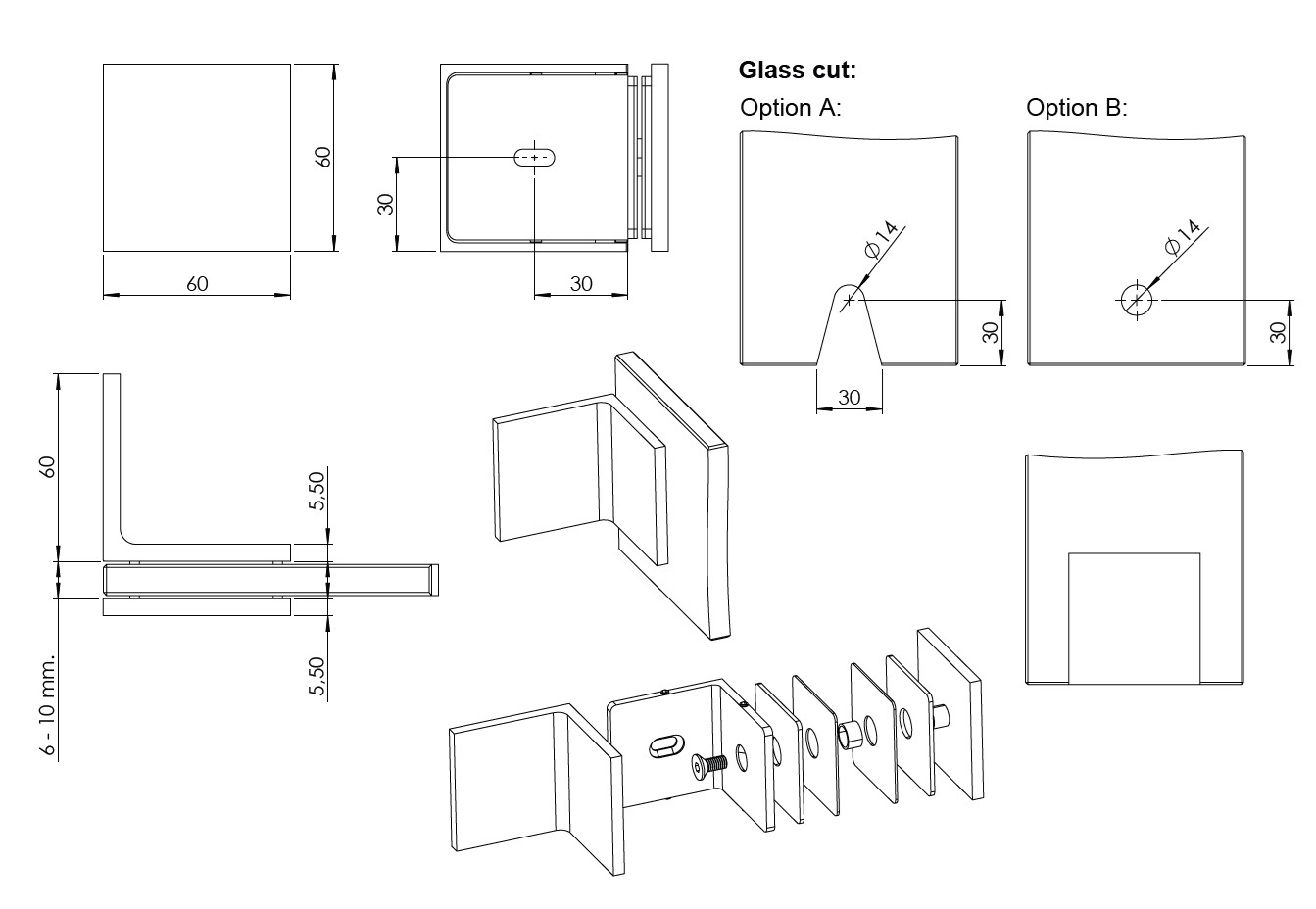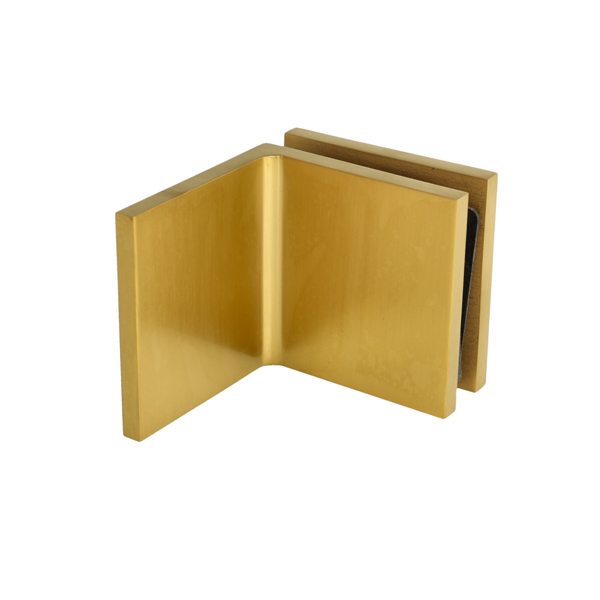 Glass Clamp "Lima", 90DG, Brushed Copper, Glass/Wall, 60x60x 20,5mm, 6-10mm Glass, Wall Mounted By ø5mm Screw Hole, Glass Mounted By ø14mm Drilling, Hidden Screws, Brass, Alu & SS-304 Material