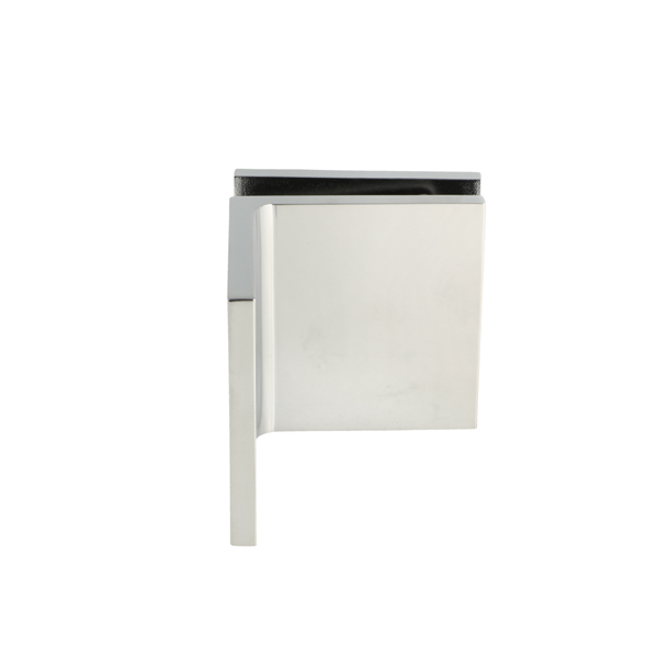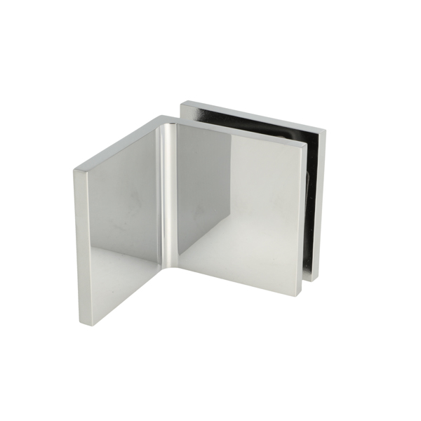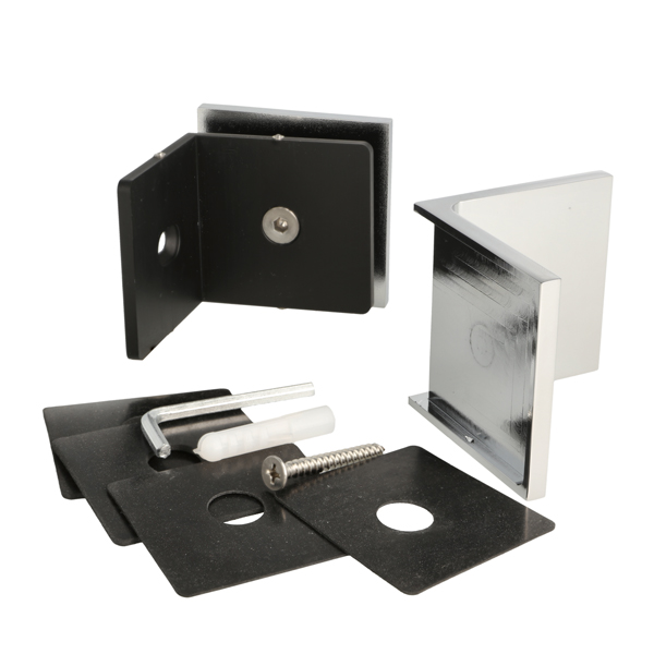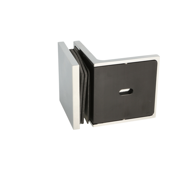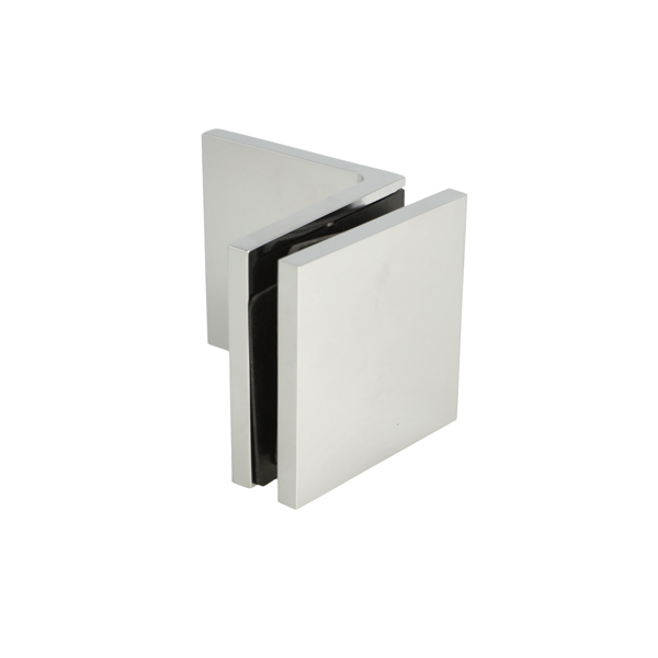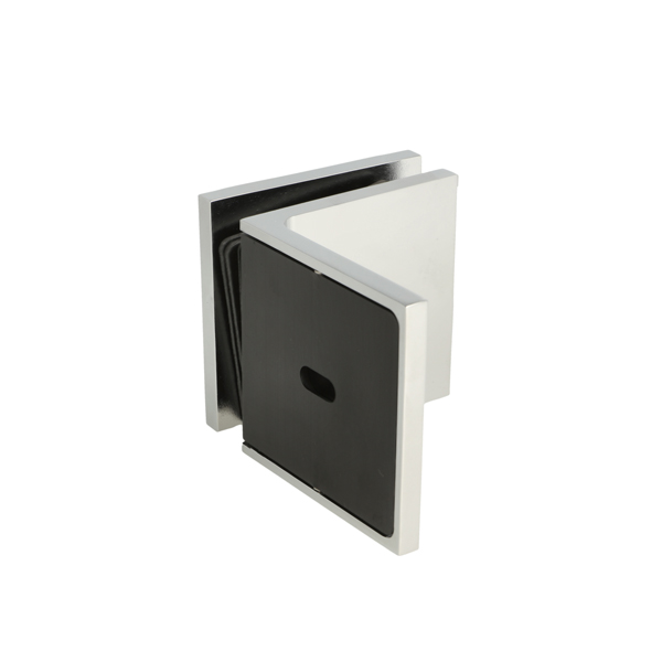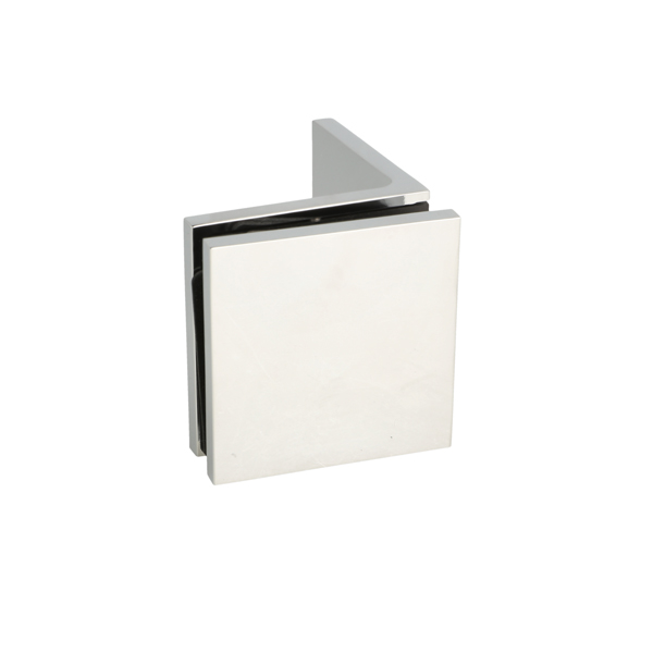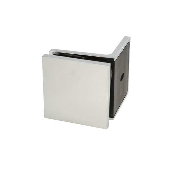 Glass Clamp "Lima", 90DG, CPL, Glass/Wall, 60x60x20,5mm, 6-10mm Glass, Wall Mounted By ø5mm Screw Hole, Glass Mounted By ø14mm Drilling, Hidden Screws, Brass, Alu & SS-304 Material