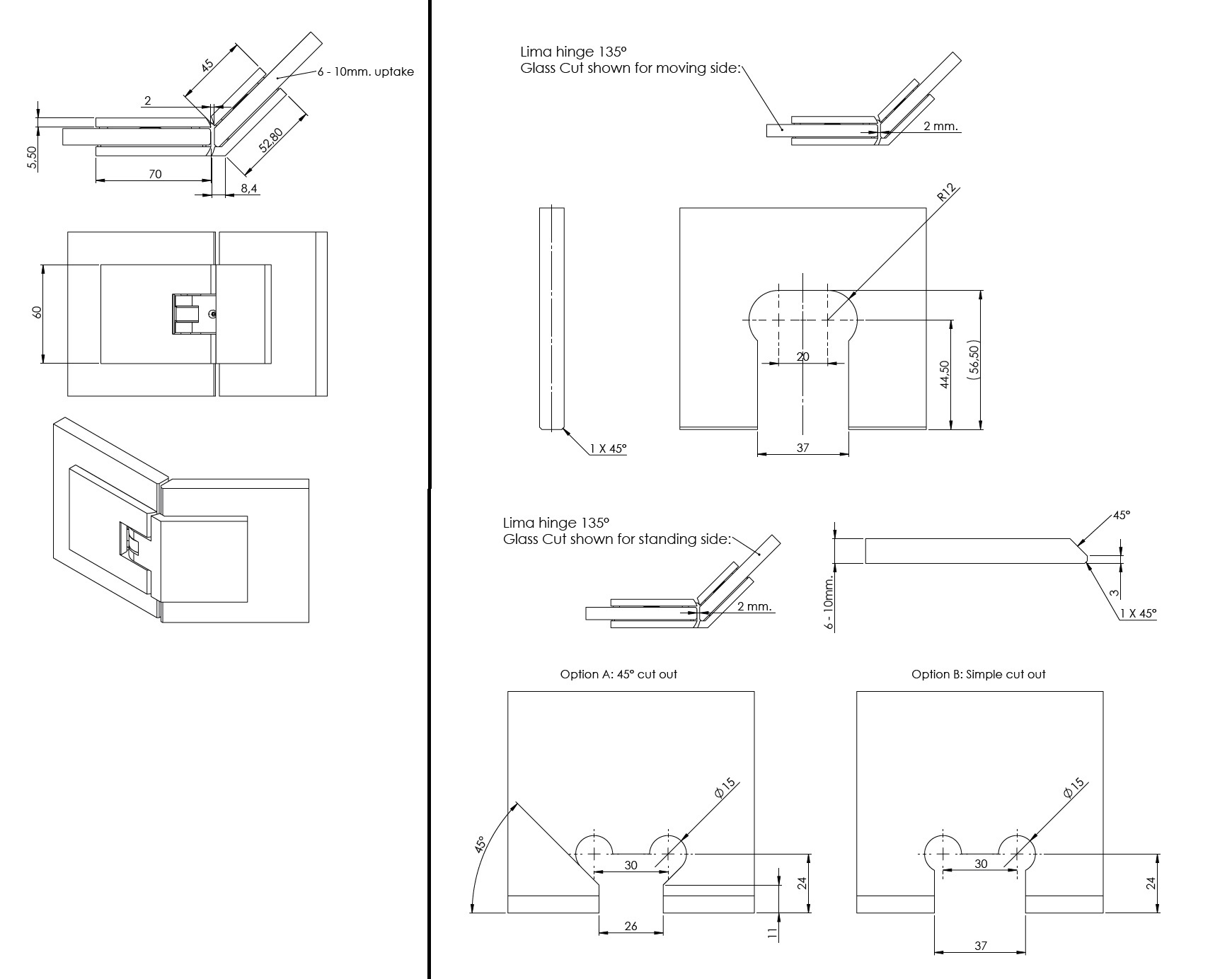 Shower Hinge "Lima", 135DG, CPL, Glass/Glass, 6-10mm Glass Thickness, W/15 DG Angle Adjustment Function & 15DG Return Function, Brass Material, Hidden Screws. Black Rubber Gaskets: 4 x 1mm & 4 x 2mm Thickness. Load Capacity Pr. Pair: 45kg