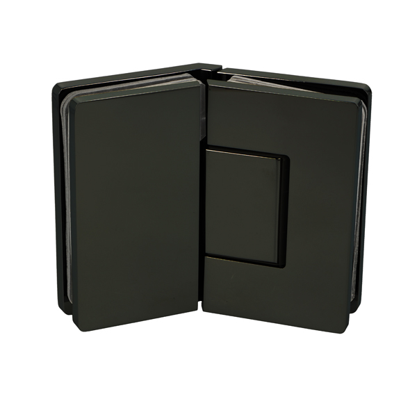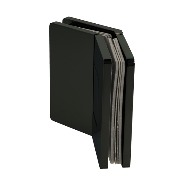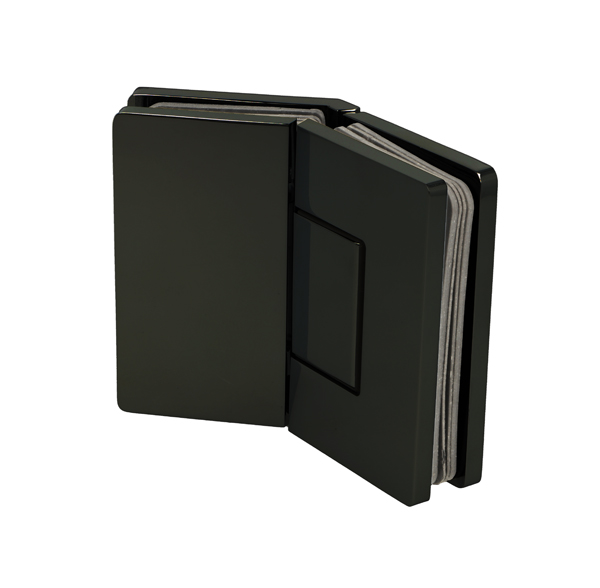 Shower Hinge "Rio", 135DG, Black Finish, Glass/Glass, 8-10mm Glass Thickness, W/15 DG Angle Adjustment Function & 15DG Return Function, Brass Material, Hidden Screws. Black Fiber Gaskets: 2 x 1mm & 2 x 2mm Thickness. Load Capacity Pr. Pair: 45kg