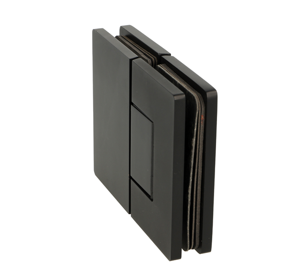 Shower Hinge "Rio", 180DG, Black Finish, Glass/Glass, 8-10mm Thickness, W/15DG Angle Adjustment Function & 15DG Return Function, Brass Material, Hidden Screws. Black Fiber Gaskets: 2 x 1mm & 2 x 2mm Thickness. Load Capacity Pr. Pair: 60kg, Max Door Widht: 1200mm.