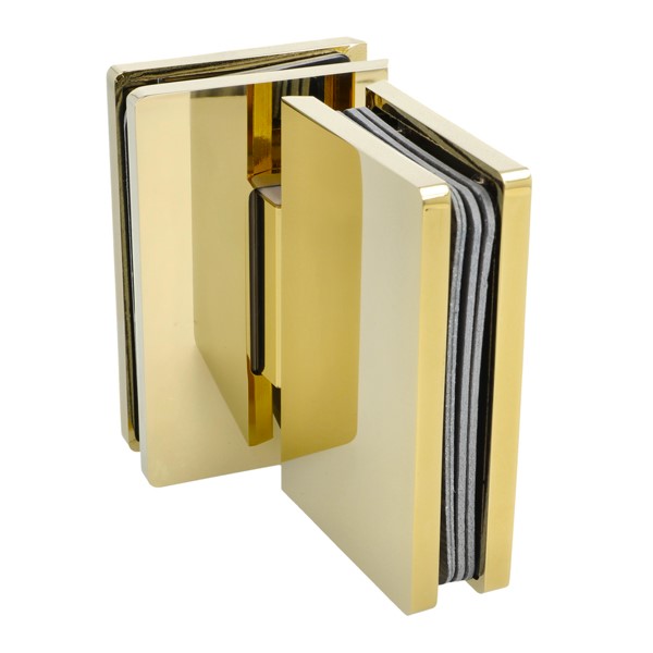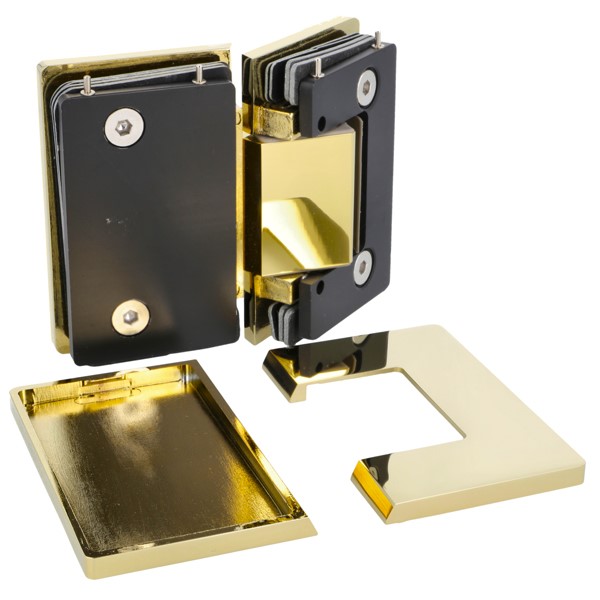 Shower Hinge "Rio", 180DG, Polished Brass, Glass/Glass, 8-10 mm Glass Thickness, W/15 DG Angle Adjustment Function & 15DG Return Function, Brass Material, Hidden Screws. Black Fiber Gaskets: 2 x 1mm & 2 x 2mm Thickness. Load Capacity Pr. Pair: 45kg