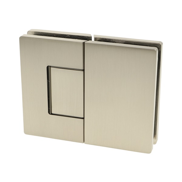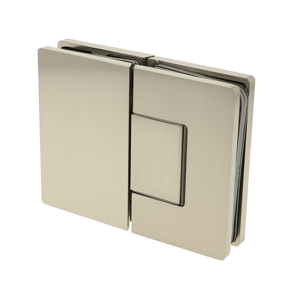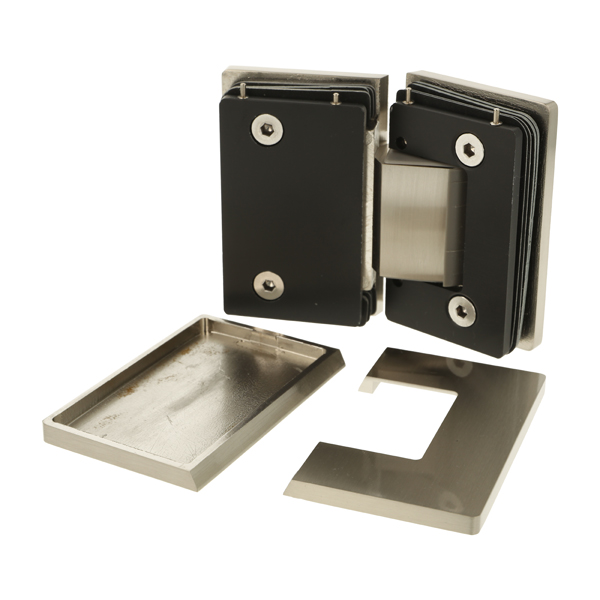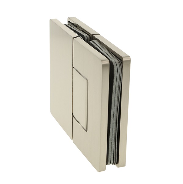 Shower Hinge "Rio", 180DG, SS-Look, Glass/Glass, 8-10mm Glass Thickness, W/15DG Angle Adjustment Function & 15DG Return Function, Brass Material, Hidden Screws. Black Fiber Gaskets: 2 x 1mm & 2 x 2mm Thickness. Load Capacity Pr. Pair: 60kg, Max Door Widht: 1200mm.