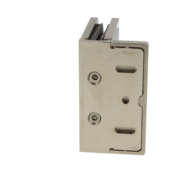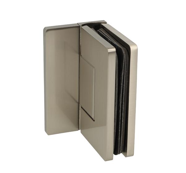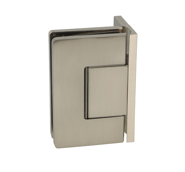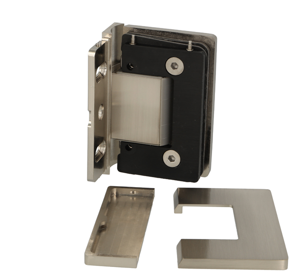 Shower Hinge "Rio", Wall/Glass, SS-Look, Offset Back Plate , 8-10mm Glass Thickness, W/15 DG Angle Adjustment Function & 15DG Return Function, Brass Material, Hidden Screws. Black Fiber Gaskets: 2 x 1mm & 2 x 2mm Thickness. Load Capacity Pr. Pair: 60kg, Max Door Widht: 1200mm.