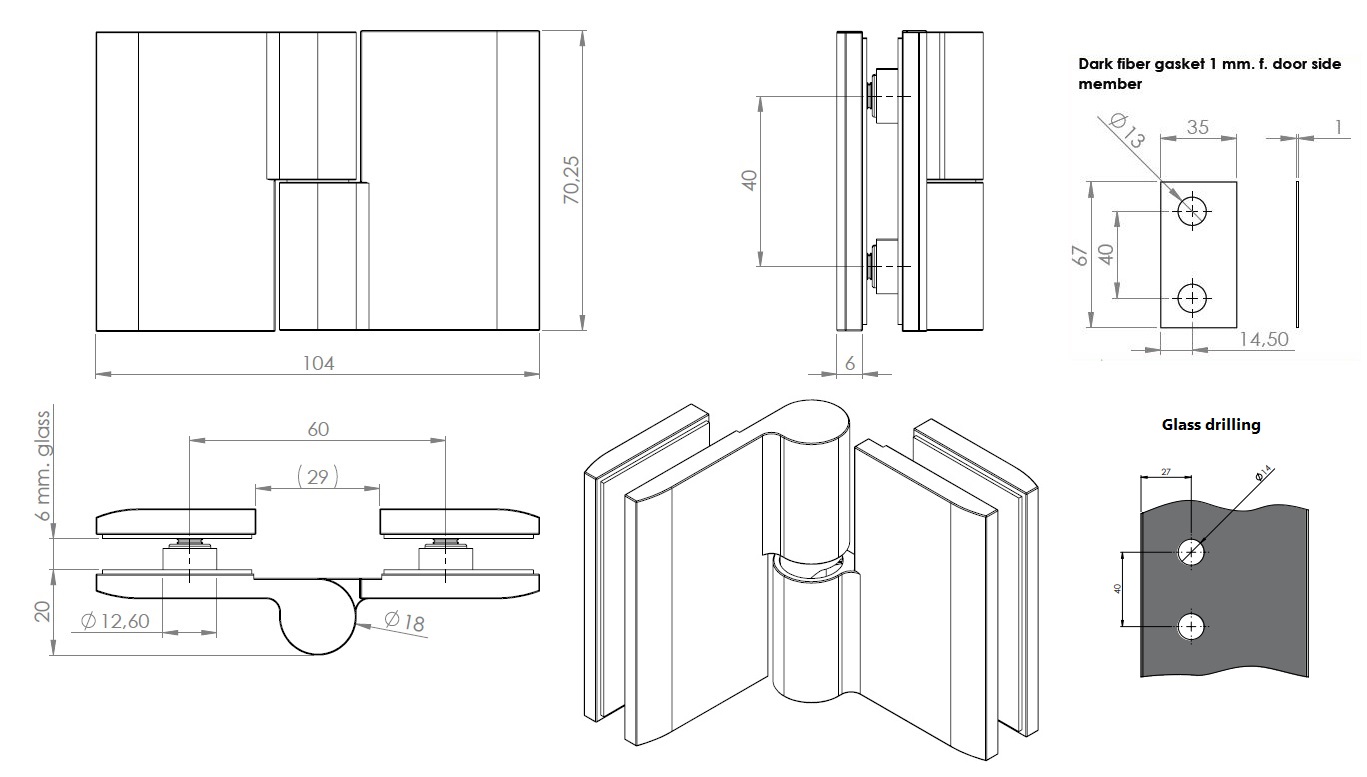 Shower Hinge "Jaro" Up/Down, CPL, 180DG, Right, Glass/Glass, 6-8mm Glass Thickness, ø14mm Drilling, All Brass Material