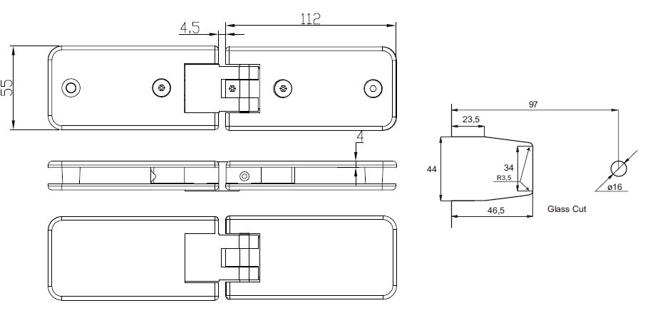 Shower Hinge "King I", 180DG, CPL, Glass/Glass, 6-10mm Glass Thickness, w/Angle Adjustment & 25DG Return Function Brass Material, Rectagular Shape, Rounded Edges & Corners