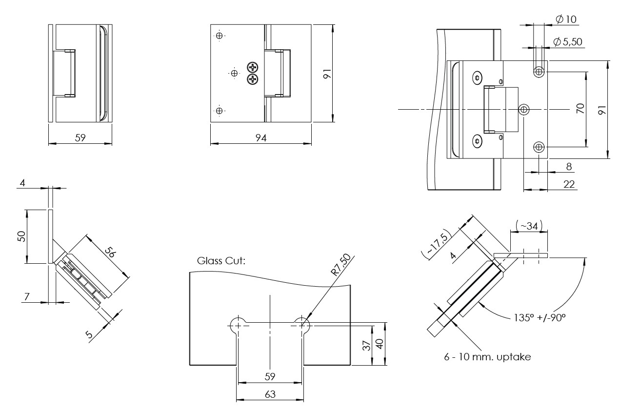 Shower Hinge "Tex III", 135DG, CPL, Wall/Glass, Offset Back Plate., 6-10mm. Glass Thickness, W/15 DG Angle Adjustable Function & 25DG Return Function, Brass Material, Straight Edges. Incl. 2 x Transp. 1mm & 2 x Transp. Cushions 2mm Th.