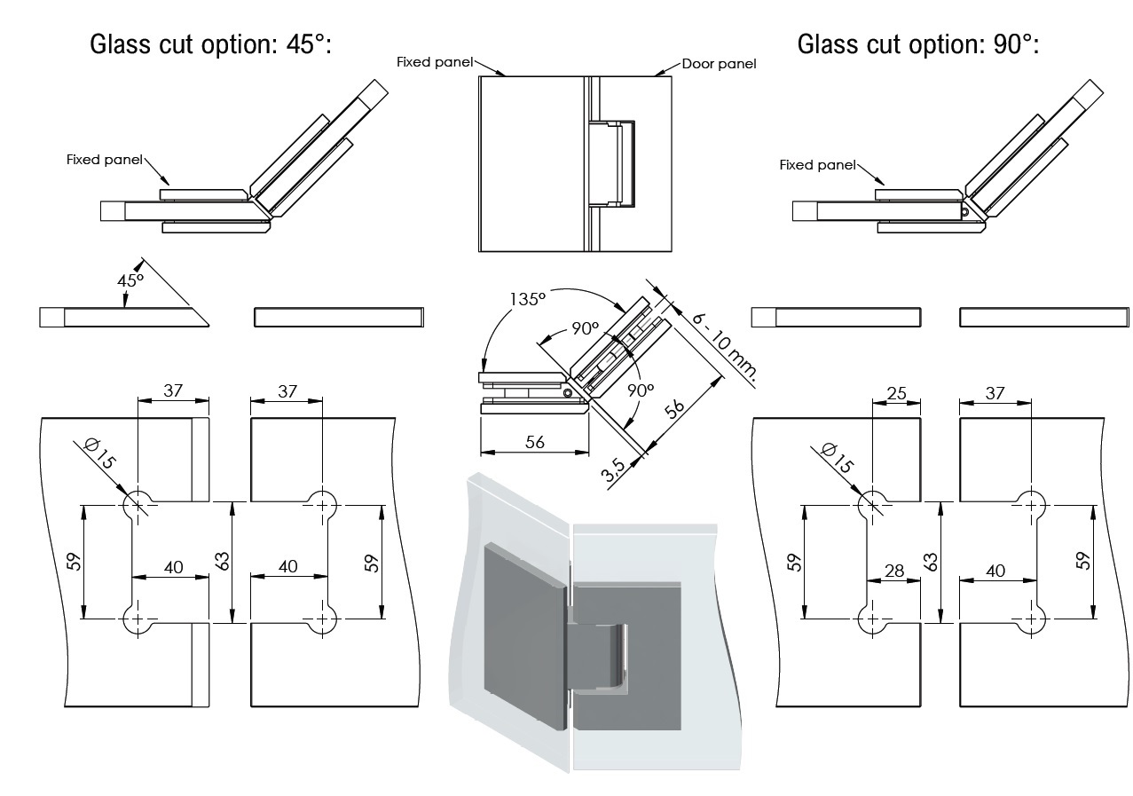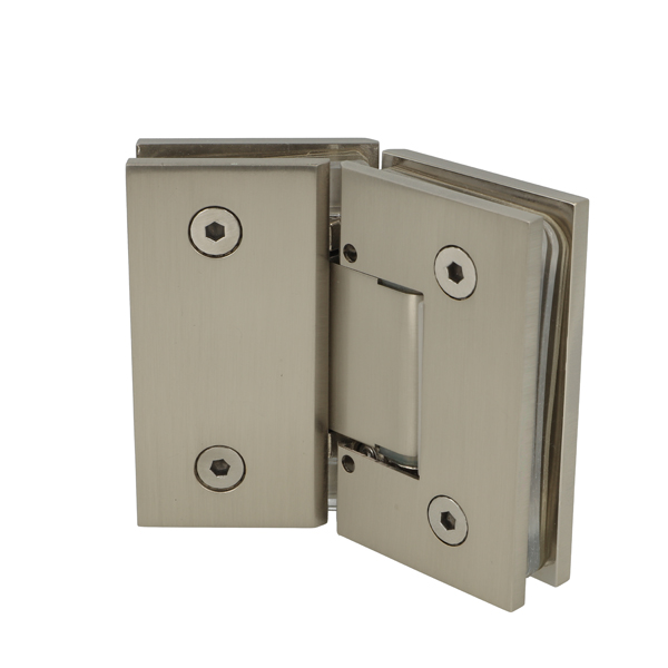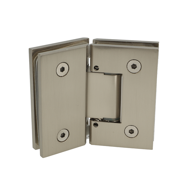 Shower Hinge "Tex III", 135DG, SS-Look, Glass/Glass, 6-10mm. Glass Thickness, W/15 DG Angle Adjustment Function & 25DG Return Function, Brass Material, Straight Edges. Incl. 4 x Transp. 1mm & 4 x Transp. Cushions 2mm Thickness