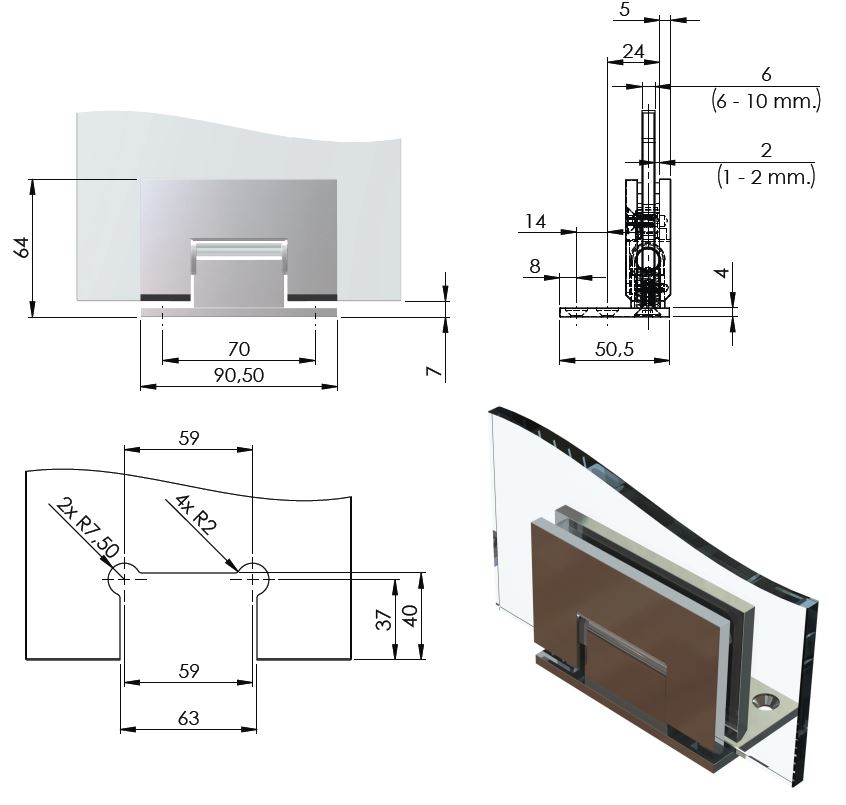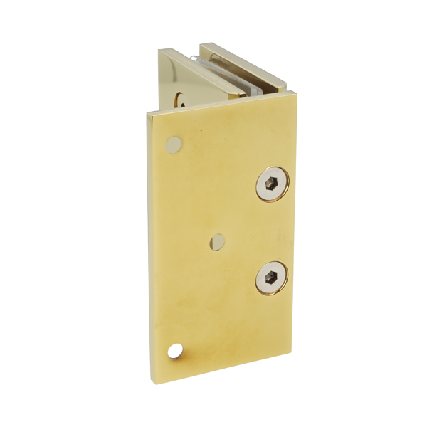 Shower Hinge "Tex III", Wall/Glass, Polished Brass, Offset Back Pl, 6-10mm Glass Thickness, W/15 DG Angle Adjustment Function & 25DG Return Function, Brass Material, Straight Edges. 2 x Transp. 1mm & 2 x Transp. Cushions 2mm Thickness