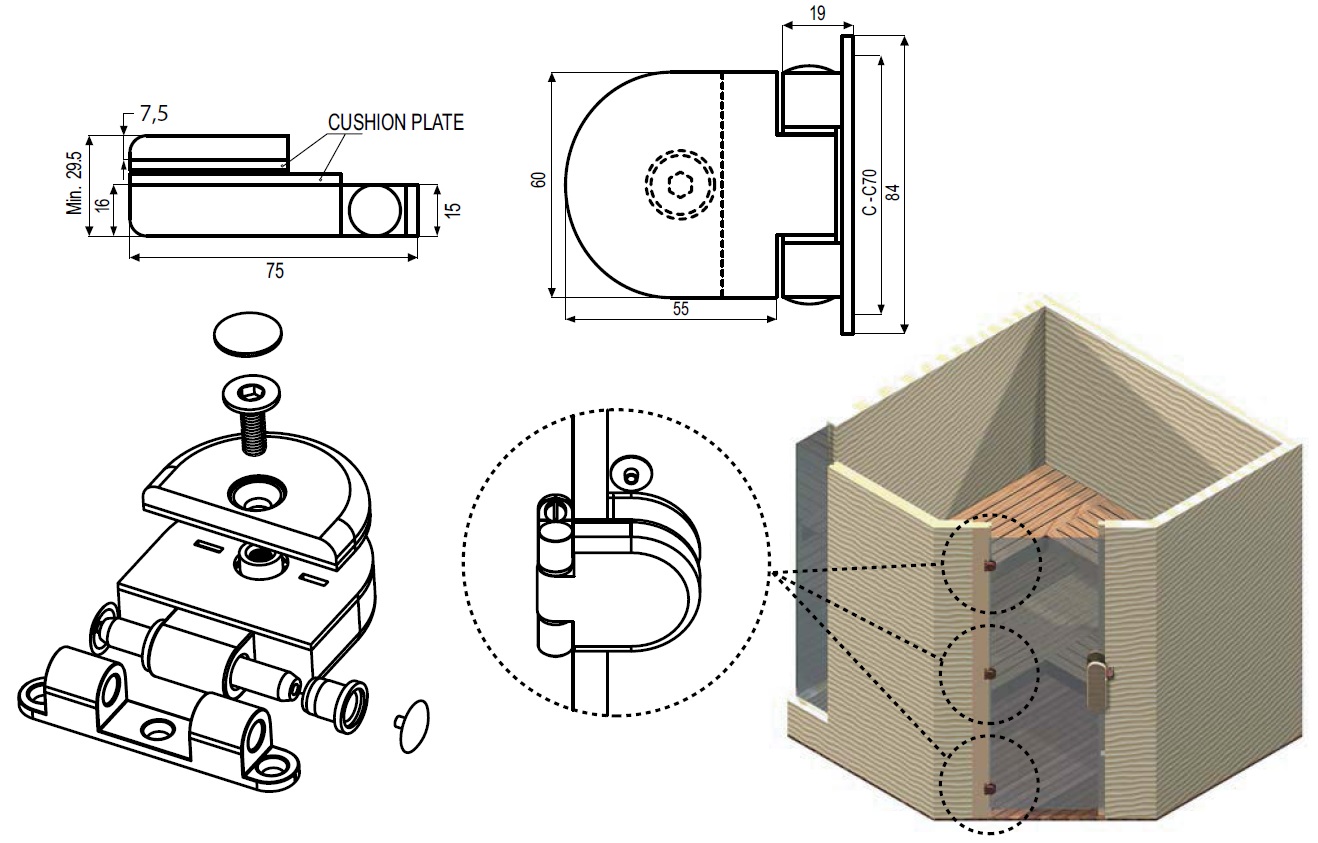 Sauna Hinge F/Glass Doors, "Slovakia", Brown Powder Painted, Bracket Mounting, Zamak Material