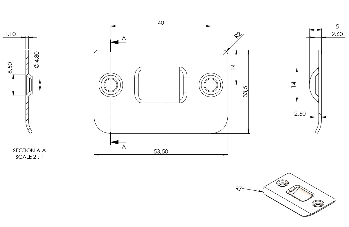 Striking Plate F/"Dania", SS-201 Brushed, 54x34mm, cc: 40mm, Incl. 2 x SS201 CSK Chipboard Screws ø4x25mm