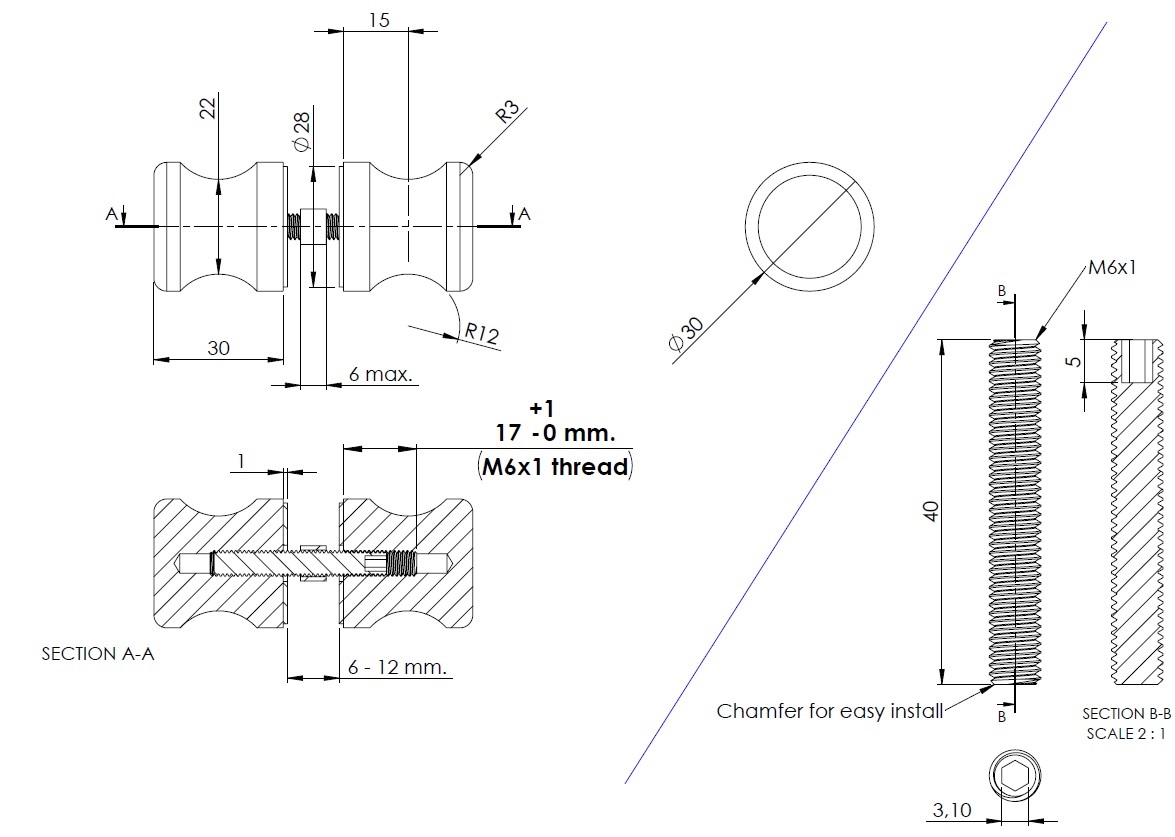 Brass Door Knob "Wien", ø30mm, CPL, 6-12mm Glass, Drill Hole ø10 mm