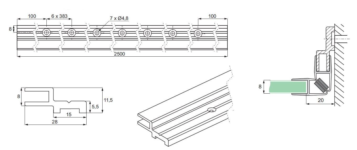 Striker Profile "Dorm" F/8mm Magnetic PVC Seal,2,5 Mtr,Poli- shed Alu,Incl. 7 x CSK SS-304 Screws ø4,2x38mm & 7 x Wall Plugs