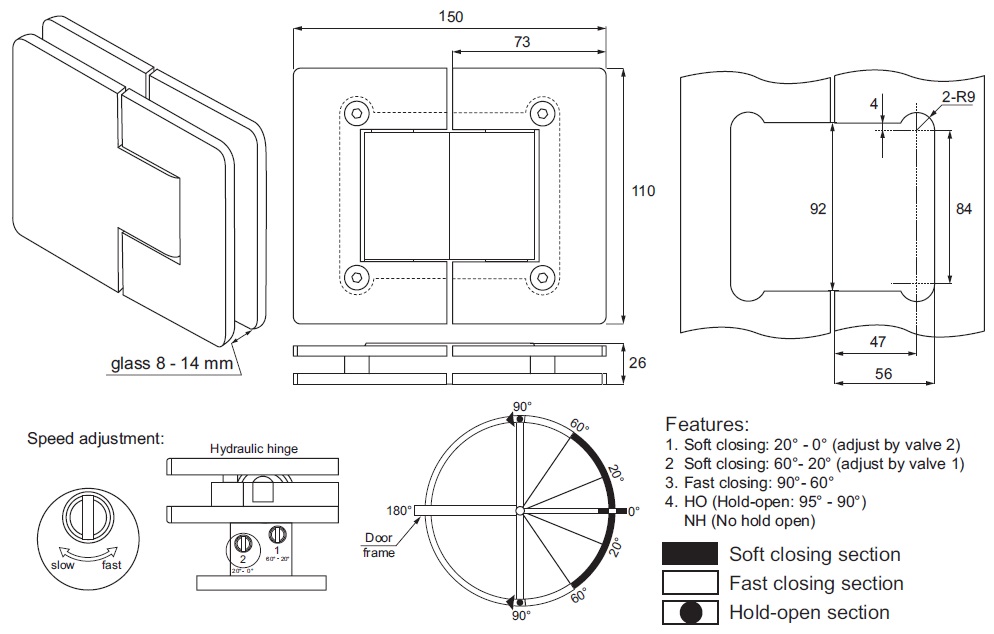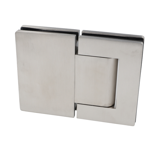 Soft Close Hinge "Klap II", Glass/Glass,SS-304, Brushed,8-14 mm, Back Plate, Brushed, Max Door Weight: 60KG, Max Door Height 2400mm, Max Door Width: 1000mm, Self-Closing at 85DG, Hold-Open at 90DG, Max Door Angle 95DG. Tested According to EN1154
