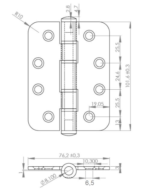 Butt Hinge, SS304, 102x76x3mm, Round Corners R10, With W/4 SS304 Washer, No Ball Bearing