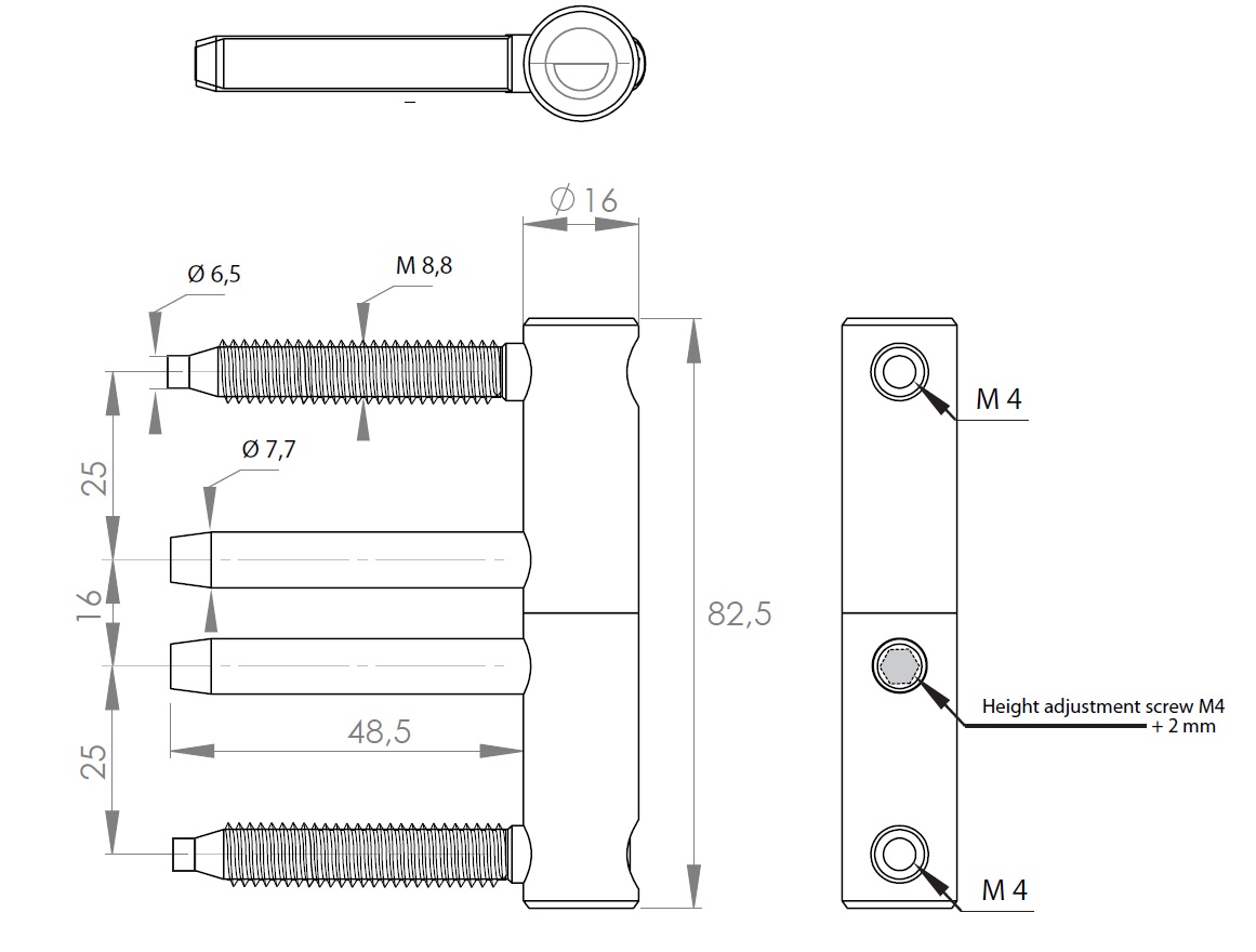 Pin Door Hinge 3-D, ø16x82mm 25-16-25mm, Steel YZP, Pin Size 2 x M8,8 x48,5mm & 2 x ø7,7mm x 48,5mm