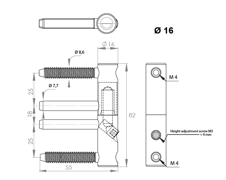 Pin Door Hinge 3-D, ø16x82mm 25-18-25mm, Steel BZP, Pin Size 2 x M8,8x49mm & 2xø7,7mm x 48,5mm, AGB Type
