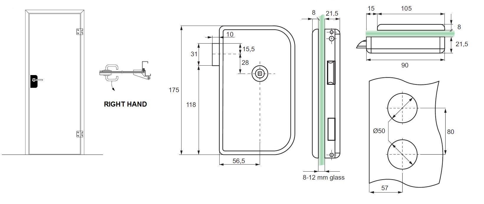 Glass Door Lock "Robin", Right, Alu-Look,W/Handle Hole Only, 8-12mm Glass