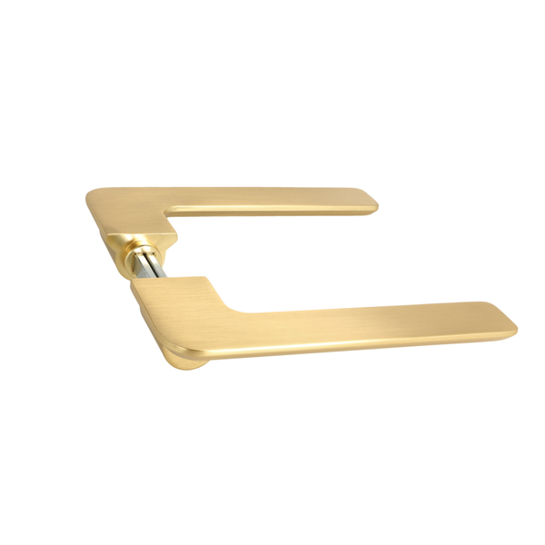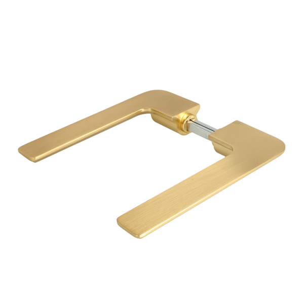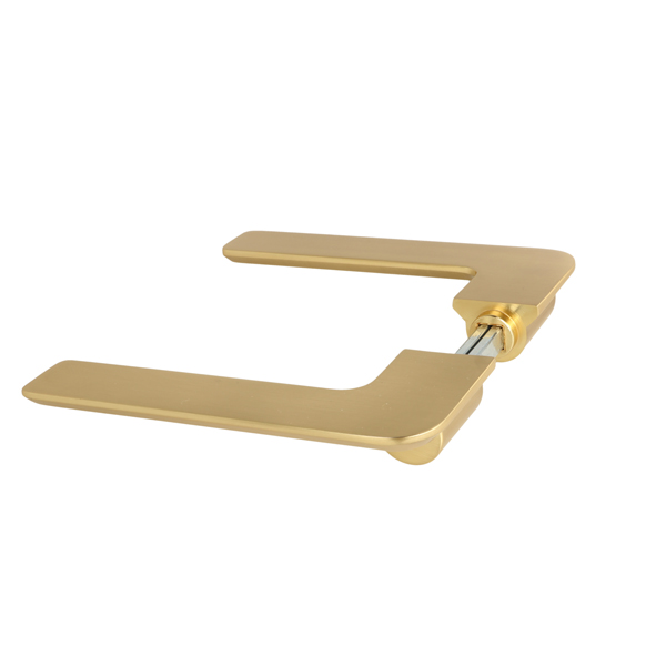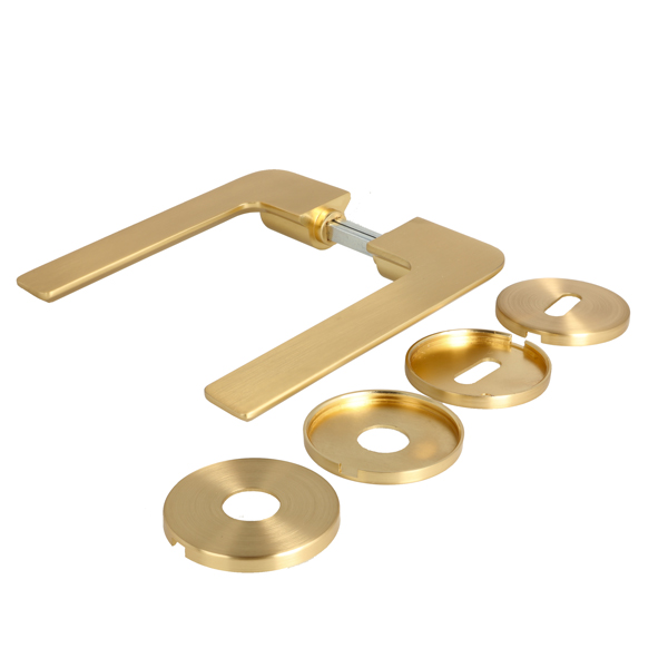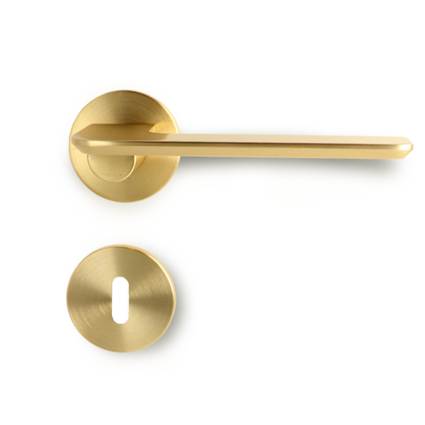 Zamak Door Handle "Disco", Brushed Brass, 8x8x95mm Split Spindle, Incl. Round Spring Rosettes, Oval Key Hole Escutcheons, Hex Key, Wooden Screws, M4 Connecting Screws & Washers. cc: 38mm. Door Thickness: 38-50mm.