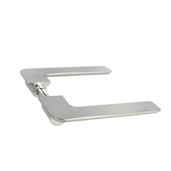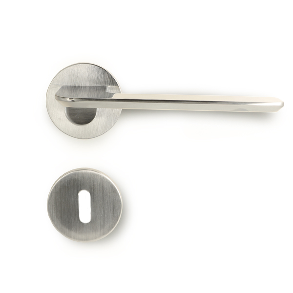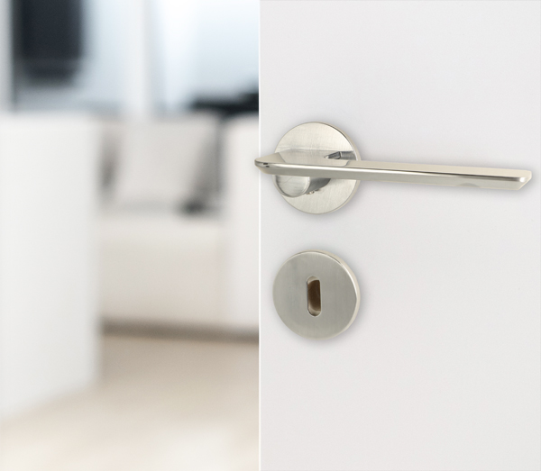 Zamak Door Handle "Disco", SS-Look, 8x8x95mm Split Spindle, Spindle, Incl. Round Spring Rosettes, Oval Key Hole Escutcheons, Hex Key, Wooden Screws, M4 Connecting Screws & Washers. cc: 38mm. Door Thickness: 38-50mm.